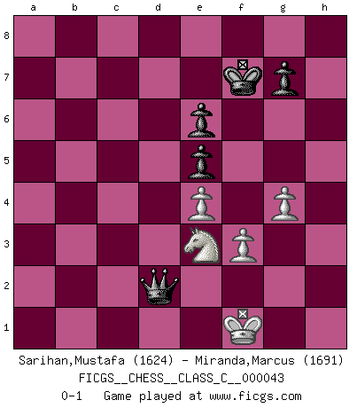 Last move : 0-1 2008 January 7 10:50:45 [Event "FICGS__CHESS__CLASS_C__000043"] [Site "FICGS"] [Date "2007.05.12"] [Round "1"] [White "Sarihan,Mustafa"] [Black "Miranda,Marcus"] [Result "0-1"] [WhiteElo "1624"] [BlackElo "1691"] 1.d4 Nf6 2.c4 e6 3.Nf3 d5 4.Nc3 c6 5.e3 Nbd7 6.Bd3 dxc4 7.Bxc4 b5 8.Bd3 Bb7 9.O-O a6 10.Qe2 c5 11.Rd1 Qc7 12.dxc5 Nxc5 13.Bc2 b4 14.Nb1 Be7 15.Nbd2 O-O 16.a3 a5 17.Nd4 Ba6 18.Qf3 Rfc8 19.b3 a4 20.axb4 axb3 21.Bxh7+ Nxh7 22.bxc5 Bb7 23.Rxa8 Bxf3 24.Rxc8+ Qxc8 25.N4xf3 Qxc5 26.Nd4 e5 27.N4xb3 Qc2 28.Re1 Nf6 29.e4 Bb4 30.Na1 Qa2 31.Nab3 Ne8 32.f3 Nd6 33.Kf2 Nb7 34.g3 Bxd2 35.Nxd2 Nc5 36.Ke2 Qc2 37.Bb2 Qxb2 38.Rb1 Qc2 39.Rb6 Ne6 40.Rxe6 fxe6 41.h3 Qc5 42.g4 Qg1 43.Nc4 Qh1 44.Ne3 Qh2+ 45.Kf1 Qxh3+ 46.Kf2 Qh2+ 47.Ke1 Kf7 48.Kf1 Qd2 0-1 This chess game has been lost on time (started : 2007.05.12 21:50:33) Queen's pawn game Kingside Castling by player White (move 9) Kingside Castling by player Black (move 15) 10 pieces endgame at move 45 : White KNPPP , Black KQPPP WHITE : King + 1 Knight 3 Pawns BLACK : King + 1 Queen 3 Pawns Player Black won this chess game. Follow this game move after move (download)The game of chess is the touchstone of the intellect. (Goethe) Wenn Spassky eine Figur opfert kannst du genauso gut aufgeben. Aber wenn Tal eine Figur opfert, spiel weiter. Er könnte noch eine weitere opfern, und dann ... wer weiß? (Miguel Najdorf) Aquel que toma al Peón de Caballo de la Reina, se pasará la noche a dormir en la calle. (Anónimo) Les échecs sont utiles à l'exercice de la faculté de penser et à celle de l'imagination. Car nous devons posséder une méthode élaborée pour atteindre des buts partout où nous devons conduire notre raison. (Leibnitz) I just play for fun. (Anna Kournikova)