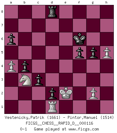 Last move : 0-1 2018 August 31 0:30:6 [Event "FICGS__CHESS__RAPID_D__000116"] [Site "FICGS"] [Date "2018.07.03"] [Round "1"] [White "Vestenicky,Patrik"] [Black "Pintor,Manuel"] [Result "0-1"] [WhiteElo "1661"] [BlackElo "1514"] 1.e4 e5 2.Nf3 Nc6 3.Bb5 Qf6 4.c3 Bc5 5.d4 exd4 6.e5 Nxe5 7.Qe2 d3 8.Qxe5+ Qe7 9.O-O Nf6 10.Re1 Bd6 11.Qxe7+ Bxe7 12.Ne5 c6 13.Bc4 d5 14.Bb3 O-O 15.Rd1 c5 16.c4 Be6 17.Bg5 h6 18.Bxf6 Bxf6 19.Re1 dxc4 20.Ba4 a6 21.Nf3 b5 22.Bd1 Rae8 23.Nc3 Bxc3 24.bxc3 Bg4 25.Rxe8 Rxe8 26.a4 b4 27.cxb4 cxb4 28.h3 Be6 29.Kf1 c3 30.Nd4 Bc4 31.Bb3 Bxb3 32.Nxb3 d2 33.Rd1 Rd8 34.Ke2 f5 35.h4 Kf7 36.h5 Kf6 37.f4 g5 38.fxg5+ hxg5 0-1 Ruy Lopez (Spanish Opening) Kingside Castling by player White (move 9) Kingside Castling by player Black (move 14) Player Black won this chess game. Follow this game move after move (download)I still hope to kill Fischer. (Boris Spassky) Die Arbeit ist etwas Unnatürliches. Die Faulheit allein ist göttlich. (Anatole France) No hay precio que no valga la pena por la cabellera del Rey enemigo. (Koblentz) Botvinnik disait en comparant les échecs à la musique: Il existe une science dont le but est l'étude de l'acoustique et des sons. Mais il y a aussi un art qui se sert de l'océan des sons : c'est la musique. De toute évidence, il en est de même pour la pensée. La logique est l'étude des lois de la réflexion et les échecs reflètent, en tant qu'art, le côté logique de la réflexion, sous la forme d'images artistiques... Extrait de Fischer - Spassky, Reykjavik 1972 par Alexander & F. Wyndham (Ed. Solar), p 37. A good aphorism is too hard for the tooth of time, and is not worn away with the centuries, although it serves as food for every speech. (Friedrich Nietzsche)