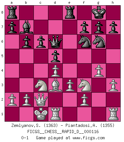 Last move : 0-1 2018 August 25 10:55:13 [Event "FICGS__CHESS__RAPID_D__000116"] [Site "FICGS"] [Date "2018.07.03"] [Round "1"] [White "Zemlyanov,Sergey"] [Black "Piantadosi,Angelo"] [Result "0-1"] [WhiteElo "1363"] [BlackElo "1355"] 1.d4 d5 2.c4 e6 3.Nc3 Nf6 4.cxd5 exd5 5.Bg5 Be7 6.e3 c6 7.Bd3 O-O 8.h3 Nbd7 9.Nf3 Re8 10.Bf4 Nf8 11.Qc2 Ng6 12.Bh2 Bd6 13.Bxd6 Qxd6 14.O-O-O b6 15.g4 Bb7 0-1 This chess game has been lost on time (started : 2018.07.03 4:35:22) QGD : Exchange, positional line Kingside Castling by player Black (move 7) Queenside Castling by player White (move 14) Player Black won this chess game. Follow this game move after move (download)Bobby just drops the pieces and they fall on the right squares. (Miguel Najdorf) Ivan Sokolov treibt mich als Beifahrer an mit go Loeky go - . (Loek van Wely) Ciertamente, de todas la drogas del mundo, el Ajedrez debe ser el mas placentero permamentemente. (Assiac) Je ne suis pas le dernier à jouer lâchement des coups douteux pendant le zeïtnot de l'adversaire pour l'achever: en effet les coups qui font le plus peur sont ceux que l'on ne comprend pas. Je me fais souvent peur quand je joue. (Un professeur anonyme) As a goal marker shodan is important. As a destination it is a poor place to stop. (Thomas Tamayo)