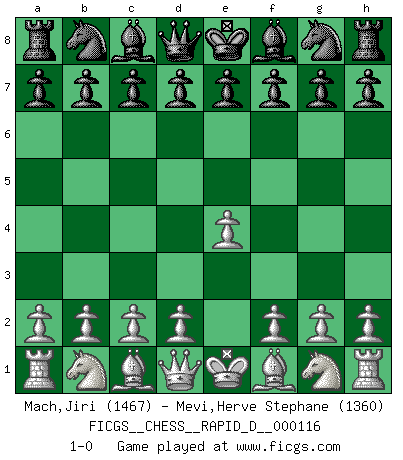 Last move : 1-0 2018 August 6 21:38:9 [Event "FICGS__CHESS__RAPID_D__000116"] [Site "FICGS"] [Date "2018.07.03"] [Round "1"] [White "Mach,Jiri"] [Black "Mevi,Herve Stephane"] [Result "1-0"] [WhiteElo "1467"] [BlackElo "1360"] 1.e4 1-0 This chess game has been lost on time (started : 2018.07.03 4:35:22) King's pawn Opening Player White won this chess game. Follow this game move after move (download)Chess is a beautiful mistress. (Bent Larsen) Wenn Schach ein enormer Dschungel ist, der seine Myriaden von Geheimnissen nicht preisgeben will, dann sind Computer die Kettensägen einer gewaltigen ökologisch unsensiblen Nutzholzfirma. (Nigel Short) Yo nunca en mi vida he jugado la Defensa Francesa, que viene siendo la más aburrida de todas las Aperturas. (Wilhelm Steinitz) Shah mat. Le roi est mort. Cri de fierté d'un joueur venant de terrasser son adversaire, courtoisement, sans effusion de sang. You must do what you feel is right... of course. (Obi-Wan Kenobi in Star Wars ep.4)