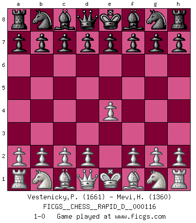 Last move : 1-0 2018 August 2 8:57:20 [Event "FICGS__CHESS__RAPID_D__000116"] [Site "FICGS"] [Date "2018.07.03"] [Round "1"] [White "Vestenicky,Patrik"] [Black "Mevi,Herve Stephane"] [Result "1-0"] [WhiteElo "1661"] [BlackElo "1360"] 1.e4 1-0 This chess game has been lost on time (started : 2018.07.03 4:35:22) King's pawn Opening Player White won this chess game. Follow this game move after move (download)Chess teaches you to control the initial excitement you feel when you see something that looks good and it trains you to think objectively when you're in trouble. (Stanley Kubrick) Wenn Capablanka heute auf der Schachbühne erscheinen würde, hätte er ein halbes Jahr gebraucht um sich die Schachtheorie anzueignen. Und dann hätte er alles und jeden besiegt. (Mikhail Moiseyevich Botvinik) No puedes jugar al Ajedrez si eres de corazón noble. (Proverbio Francés) Aidez vos pièces, elles vous aideront. (Paul Morphy) If you work for a living, why do you kill yourself working ? (Tuco to a chicken in The Good, The Bad and The Ugly)