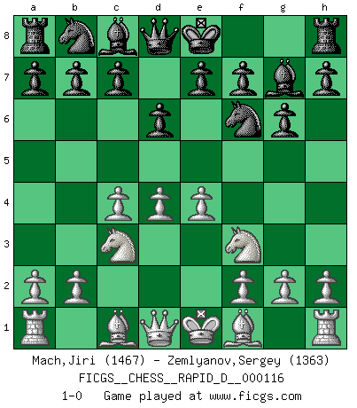 Last move : 1-0 2018 September 10 0:11:48 [Event "FICGS__CHESS__RAPID_D__000116"] [Site "FICGS"] [Date "2018.07.03"] [Round "1"] [White "Mach,Jiri"] [Black "Zemlyanov,Sergey"] [Result "1-0"] [WhiteElo "1467"] [BlackElo "1363"] 1.c4 Nf6 2.Nc3 g6 3.d4 Bg7 4.e4 d6 5.Nf3 1-0 This chess game has been lost on time (started : 2018.07.03 4:35:22) English Opening Player White won this chess game. Follow this game move after move (download)We must make sure that Chess will not be like a dead language, very interesting, but for a very small group. (Sytze Faber) Schach ist mein Leben, meine Leidenschaft, was ich gelernt habe und seit meinem 14. Lebensjahr profimässig praktiziere. Darauf zu verzichten, würde mir sehr schwer fallen. (Viktor Kortschnoi) El Ajedrez es una hermosa aventura. (Bent Larsen) Aux échecs, les retours au sommet sont rares : les dommages psychologiques consécutifs à une défaite sont trop sévères. (Daily Telegraph) If we knew what we were doing, we would not call it research. (Albert Einstein)
