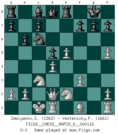 Last move : 0-1 2018 September 18 13:43:36 [Event "FICGS__CHESS__RAPID_D__000116"] [Site "FICGS"] [Date "2018.07.03"] [Round "1"] [White "Zemlyanov,Sergey"] [Black "Vestenicky,Patrik"] [Result "0-1"] [WhiteElo "1363"] [BlackElo "1661"] 1.d4 Nf6 2.c4 b6 3.f3 e6 4.e4 Bb4+ 5.Bd2 Bxd2+ 6.Qxd2 O-O 7.Nc3 d5 8.cxd5 exd5 9.e5 Nh5 10.O-O-O Re8 11.g4 Nc6 12.gxh5 Nb4 13.Nge2 Nc6 0-1 This chess game has been lost on time (started : 2018.07.03 4:35:22) Queen's Indian Accelerated Kingside Castling by player Black (move 6) Queenside Castling by player White (move 10) Player Black won this chess game. Follow this game move after move (download)A bad day of Chess is better than any good day at work. (Anonymous) Frage des Reporters: -Welche besonderen Umstände rechtfertigen das Anhalten der Uhren während einer Turnierpartie? Antwort: -Einen Fotographen zu strangulieren. (Siegbert Tarrasch) La esencia del Ajedrez es pensar acerca de lo que el Ajedrez es. (David Bronstein) Karpov est une pièce de musée. (Garry Kasparov) At last I discovered the true beauty of chess. So I proposed to her. (Dinesh De Silva)