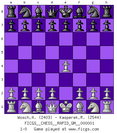 Last move : 1-0 2018 August 2 20:56:50 [Event "FICGS__CHESS__RAPID_GM__000001"] [Site "FICGS"] [Date "2018.07.03"] [Round "1"] [White "Wosch,Arkadiusz"] [Black "Kasperek,Ryszard"] [Result "1-0"] [WhiteElo "2403"] [BlackElo "2544"] 1.e4 1-0 This chess game has been lost on time (started : 2018.07.03 19:56:41) King's pawn Opening Player White won this chess game. Follow this game move after move (download)The Pawns are the soul of the game. (Francois Andre Danican Philidor) Sicherlich können nur Meister einen Stil haben. Daß ein nicht-Meister auch nur ein einziges Mal in seinem Leben eine Partie folgerecht durchführte, habe ich niemals bemerkt. (Emanuel Lasker) Un entendimiento a fondo de las continuaciones típicas del mate, hace de las combinaciones de sacrificio mas complicadas conducirlas a ellas no solo sin dificultad, sino casi de una manera natural. (Siegbert Tarrasch) Un footballeur joue avec ses pieds, parfois avec sa tête. Un joueur d'échecs ne joue qu'avec sa tête. Et quand il ne joue plus, il meurt. (Jacob Murray) Players are not good because they find tactics, it is about the way to find the positions in which those tactics are hidden. (Luc-Olivier Leclerc)