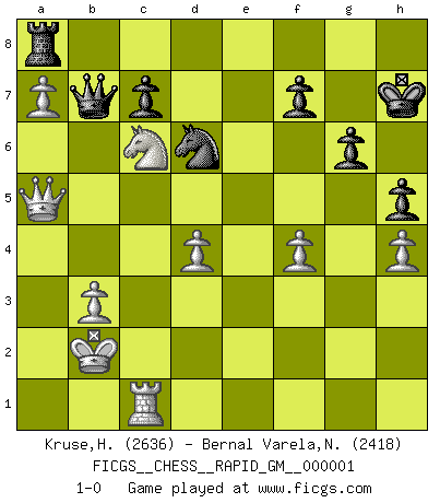 Last move : 1-0 2018 October 2 11:19:22 [Event "FICGS__CHESS__RAPID_GM__000001"] [Site "FICGS"] [Date "2018.07.03"] [Round "1"] [White "Kruse,Herbert"] [Black "Bernal Varela,Nelson"] [Result "1-0"] [WhiteElo "2636"] [BlackElo "2418"] 1.e4 e6 2.d4 d5 3.Nc3 Nf6 4.Bg5 dxe4 5.Nxe4 Be7 6.Nxf6+ Bxf6 7.Bxf6 Qxf6 8.Nf3 O-O 9.Qd3 Rd8 10.O-O-O Bd7 11.Rd2 a6 12.h4 Bb5 13.c4 Bc6 14.Ne5 b5 15.Qe3 bxc4 16.Bxc4 Bd5 17.Bxd5 Rxd5 18.Qe4 Qd8 19.Kb1 Nd7 20.Nc6 Qf8 21.Rc2 Qd6 22.a3 a5 23.Rhc1 h5 24.g3 g6 25.Qf3 Kg7 26.Qe2 Rf5 27.f4 Rd5 28.a4 Kg8 29.Rc3 Re8 30.Qf2 Nf6 31.Qc2 Rf8 32.Rc4 Ng4 33.Qc3 Nf6 34.Rc2 Ne4 35.Qf3 Nf6 36.b3 Ra8 37.Ka2 Kg7 38.Qc3 Ne4 39.Qe3 Nf6 40.Kb2 Rf5 41.Qd2 Rd5 42.Ne5 Rc8 43.Qc3 Ne4 44.Qd3 Nf6 45.Rc6 Qd8 46.R2c4 Qe7 47.Qc3 Ne8 48.R4c5 Qd8 49.Nf3 Qd7 50.Rxd5 exd5 51.Ne5 Qh3 52.Qxa5 Qxg3 53.Qxd5 Nd6 54.Nf3 Qg2+ 55.Rc2 Qh3 56.a5 Qf1 57.Qe5+ Kg8 58.Qe2 Qh3 59.a6 Qf5 60.a7 Qa5 61.Ne5 Ra8 62.Nc6 Qb6 63.Qe5 Kh7 64.Rc1 Qb7 65.Qa5 1-0 French : Burn variation Kingside Castling by player Black (move 8) Queenside Castling by player White (move 10) Player White won this chess game. Follow this game move after move (download)I have never in my life played the French Defence, which is the dullest of all openings. (Wilhelm Steinitz) Vom Schach wurde gesagt das Leben sei dafür nicht lange genug. Aber das ist der Fehler des Lebens, nicht des Schach'. (Irving Chernev) Aquellos que dicen entender al Ajedrez, no entienden nada. (Robert Hubner) Nous sommes les pions de la mystérieuse partie d'Echecs jouée par Dieu. Il nous déplace, nous arrête, nous pousse encore, puis nous lance un à un dans la boîte du Néant. Epitaphe sur la tombe de David Janowsky (1868-1927). I don't diet. I just don't eat as much as I'd like to. (Linda Evangelista, supermodel)