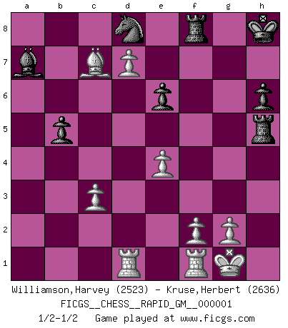 Last move : 1/2-1/2 2018 September 1 16:23:47 [Event "FICGS__CHESS__RAPID_GM__000001"] [Site "FICGS"] [Date "2018.07.03"] [Round "1"] [White "Williamson,Harvey"] [Black "Kruse,Herbert"] [Result "1/2-1/2"] [WhiteElo "2523"] [BlackElo "2636"] 1.e4 e5 2.Bc4 Nf6 3.d3 Nc6 4.Nf3 Bc5 5.c3 d6 6.O-O O-O 7.Bg5 h6 8.Bh4 g5 9.Bg3 a6 10.a4 Ba7 11.Nbd2 Nh7 12.h3 g4 13.hxg4 Bxg4 14.Qe1 Qf6 15.Kh1 Kh8 16.Nh4 Rg8 17.b4 Be6 18.Bxe6 fxe6 19.b5 Ne7 20.Ndf3 Qf7 21.Rb1 Qh5 22.a5 b6 23.d4 Ng6 24.dxe5 Raf8 25.Qd1 Nxh4 26.Nxh4 Rg4 27.Kg1 Rxh4 28.Qxh5 Rxh5 29.exd6 bxa5 30.d7 Ng5 31.Rbd1 Nf7 32.Bxc7 axb5 33.Bxa5 Nd8 34.Bc7 1/2-1/2 Bishop's Opening : Berlin defense Kingside Castling by player White (move 6) Kingside Castling by player Black (move 6) This chess game ended in a draw. Follow this game move after move (download)A win by an unsound combination, however showy, fills me with artistic horror. (Wilhelm Steinitz) Wenn Dein Gegner dir ein Remis anbietet, versuch herauszufinden, weshalb er glaubt schlechter zu stehen. (Nigel Short) Ser exitoso en el Ajedrez te permite descubrir tu propia personalidad. Eso es lo que deseo para los niños de mi clase. (Saudin Robovic) Il vaut mieux sacrifier les pièces de l'adversaire. (Xavier Tartacover) If passion drives you, let reason holds the reins. (Benjamin Franklin)
