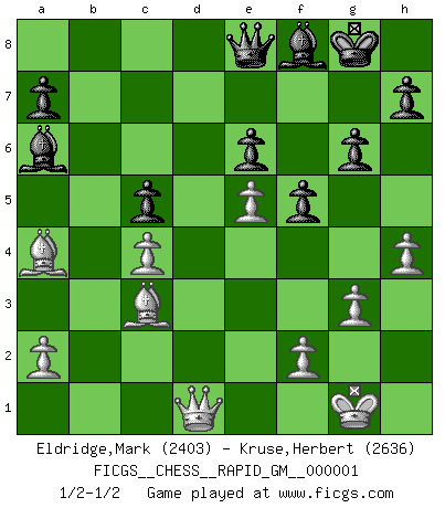 Last move : 1/2-1/2 2018 September 1 16:2:47 [Event "FICGS__CHESS__RAPID_GM__000001"] [Site "FICGS"] [Date "2018.07.03"] [Round "1"] [White "Eldridge,Mark"] [Black "Kruse,Herbert"] [Result "1/2-1/2"] [WhiteElo "2403"] [BlackElo "2636"] 1.d4 Nf6 2.c4 e6 3.Nf3 b6 4.g3 Ba6 5.b3 Bb4+ 6.Bd2 Be7 7.Bg2 c6 8.Bc3 d5 9.Nbd2 Nbd7 10.e4 Nxe4 11.Nxe4 dxe4 12.Ne5 Nxe5 13.dxe5 O-O 14.Bxe4 b5 15.O-O bxc4 16.Qe2 Qc7 17.bxc4 Rab8 18.Rad1 g6 19.Bc2 Bc5 20.h4 f5 21.Bb3 Rbd8 22.Rxd8 Rxd8 23.Rd1 Bf8 24.Rxd8 Qxd8 25.Qd2 Qe8 26.Qd1 c5 27.Ba4 1/2-1/2 Queen's Indian : Nimzovich variation (exaggerated Fianchetto) Kingside Castling by player Black (move 13) Kingside Castling by player White (move 15) This chess game ended in a draw. Follow this game move after move (download)The hardest game to win is a won game. (Emanuel Lasker) Privat ist Kortschnoi kein schlechter Mensch, sehr sympathisch. Aber während des Spiels ist er grausam. Er will dich töten. (Miguel Najdorf) Una victoria por una combinación errónea, aunque sea espectacular, me llena de horror artístico. (Wilhelm Steinitz) Aux échecs, l'amour-propre est satisfait quand on remporte la victoire, mais il n'y a pas de honte à être battu. (Benjamin Franklin) There is far too much law for those who can afford it and far too little for those who cannot. (Derek Bok)