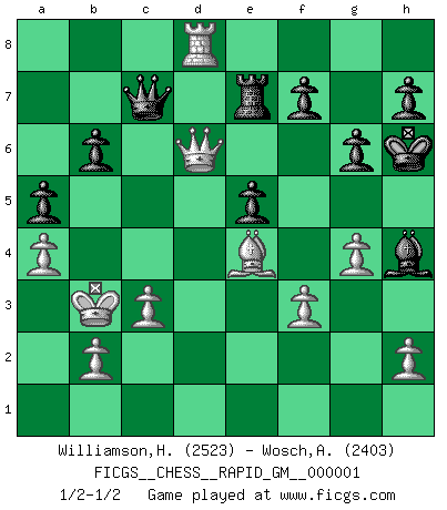 Last move : 1/2-1/2 2018 September 23 10:28:54 [Event "FICGS__CHESS__RAPID_GM__000001"] [Site "FICGS"] [Date "2018.07.03"] [Round "1"] [White "Williamson,Harvey"] [Black "Wosch,Arkadiusz"] [Result "1/2-1/2"] [WhiteElo "2523"] [BlackElo "2403"] 1.e4 c5 2.Nf3 Nc6 3.d4 cxd4 4.Nxd4 Nf6 5.Nc3 d6 6.f3 e5 7.Nb3 Be7 8.Be3 O-O 9.Qd2 a5 10.Bb5 Be6 11.O-O-O Na7 12.Bxa7 Rxa7 13.Qe3 Qb8 14.a4 Rd8 15.Kb1 b6 16.Rd3 d5 17.exd5 Nxd5 18.Nxd5 Rxd5 19.Rxd5 Bxd5 20.Rd1 Be6 21.Nd2 Qc7 22.Qe4 Bf6 23.Nc4 g6 24.Bc6 Bxc4 25.Qxc4 Qc8 26.Qb5 Kg7 27.g4 Re7 28.Be4 Qc7 29.c3 Qb8 30.Bc2 Bg5 31.Rd5 Qc7 32.Ka2 Bf6 33.Be4 Kg8 34.Qd3 Bh4 35.Rd6 Bf2 36.Rd8+ Kg7 37.Qd5 Bh4 38.Kb3 Qa7 39.Qd2 Qc7 40.Qd6 Kh6 1/2-1/2 Sicilian defense Kingside Castling by player Black (move 8) Queenside Castling by player White (move 11) This chess game ended in a draw. Follow this game move after move (download)After a bad opening, there is hope for the middle game. After a bad middle game, there is hope for the endgame. But once you are in the endgame, the moment of truth has arrived. (Edmar Mednis) Zu meiner Zeit war ein 20 jähriger ein junger Spieler, heute ist er ein Veteran. (Garry Kasparov) Aquel que ve no otra dirección en el juego que la de dar Jaque Mate a su oponente, nunca será un buen jugador de Ajedrez. (Euwe) Ne tendez aucun piège pour le plaisir ! Ne jouez rien dans l'espoir que l'adversaire réagisse de façon stupide ! Prenez toujours pour acquis que l'adversaire va trouver le meilleur coup ! Ne jouez jamais de coup dans l'espoir que l'adversaire ne voie pas la menace ! Chacun de vos coups doit améliorer la position d'une façon ou d'une autre. Quotation,n.: The act of repeating erroneously the words of another. The words erroneously repeated. (Ambrose Bierce, The Devil's Dictionary)