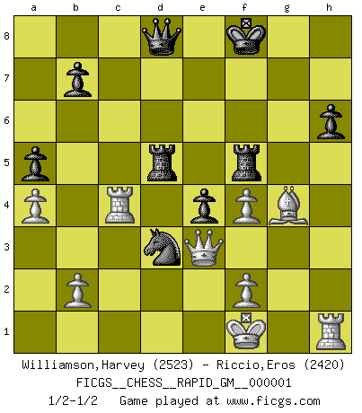 Last move : 1/2-1/2 2018 August 14 17:33:0 [Event "FICGS__CHESS__RAPID_GM__000001"] [Site "FICGS"] [Date "2018.07.03"] [Round "1"] [White "Williamson,Harvey"] [Black "Riccio,Eros"] [Result "1/2-1/2"] [WhiteElo "2523"] [BlackElo "2420"] 1.e4 e5 2.Bc4 Nf6 3.d3 c6 4.Nf3 d5 5.Bb3 a5 6.a4 Bb4+ 7.c3 Bd6 8.exd5 cxd5 9.Bg5 Be6 10.Na3 Nbd7 11.Nb5 Bb8 12.d4 e4 13.Nd2 h6 14.Bh4 Bf4 15.Nf1 g5 16.Bg3 Kf8 17.Bxf4 gxf4 18.Qd2 Nh5 19.Bd1 Ndf6 20.g3 Ra6 21.c4 Rg8 22.gxf4 dxc4 23.Ng3 Nxg3 24.hxg3 Nd5 25.Nc3 Nb4 26.Kf1 Rd6 27.Qe3 Rg6 28.Rc1 f5 29.d5 Bxd5 30.Bh5 Rge6 31.g4 Nd3 32.gxf5 Rf6 33.Nxd5 Rxd5 34.Rxc4 R6xf5 35.Bg4 1/2-1/2 Bishop's Opening : Berlin defense This chess game ended in a draw. Follow this game move after move (download)Chess is mental torture. (Garry Kasparov) Ein Remis kann durch Wiederholung von drei Zügen oder durch einen schlechte Zug erreicht werden. (Savielly Grigorievitsch Tartakower) Bendita sea la memoria de aquel que dio al mundo este juego inmortal. (A. G. Gardiner) D'abord les bases : Jouez et étudiez, puis étudiez et jouez, ensuite jouez et étudiez, puis étudiez et jouez. Deuxièmement : Donnez toujours le meilleur de vous-même ! (Ken Smith) To err is human, but to really foul things up requires a computer. (Farmer's Almanac, 1978)