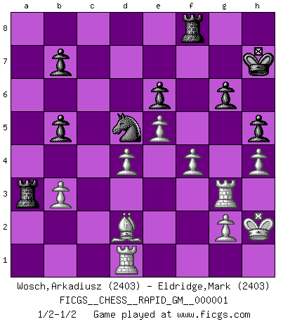 Last move : 1/2-1/2 2018 September 23 19:19:13 [Event "FICGS__CHESS__RAPID_GM__000001"] [Site "FICGS"] [Date "2018.07.03"] [Round "1"] [White "Wosch,Arkadiusz"] [Black "Eldridge,Mark"] [Result "1/2-1/2"] [WhiteElo "2403"] [BlackElo "2403"] 1.e4 e5 2.Nf3 Nc6 3.Bc4 Nf6 4.d3 Bc5 5.c3 d6 6.O-O O-O 7.h3 h6 8.Re1 a5 9.Nbd2 Be6 10.Bb5 Qb8 11.b3 Qa7 12.Re2 Ne7 13.Bc4 Ng6 14.Bxe6 fxe6 15.Nf1 Bb6 16.d4 a4 17.Ng3 Qa6 18.Be3 exd4 19.cxd4 d5 20.e5 Ne4 21.Nxe4 dxe4 22.Nd2 Qd3 23.Nc4 axb3 24.Nxb6 Qxd1+ 25.Rxd1 cxb6 26.axb3 Ne7 27.Bd2 Nd5 28.Rxe4 b5 29.Rg4 Kh7 30.h4 Ra3 31.Rg3 h5 32.f4 g6 33.Kh2 1/2-1/2 Two knights defense (Modern Bishop's Opening) Kingside Castling by player White (move 6) Kingside Castling by player Black (move 6) This chess game ended in a draw. Follow this game move after move (download)An attack on the wing should be met by play in the center. (Nimzovitch) Je mehr wir mit Computern analysieren, desto mehr glauben wir an Verteidigung. (Vladimir Kramnik) Personalmente, yo prefiero mirar hacia el futuro en donde un programa de computadora gane el título mundial de Ajedrez. La humanidad necesita una lección de humildad. (Richard Dawkings) Un journaliste : 'Vous préférez avoir une dame de plus sur l'échiquier ou au lit ?' Boris Spassky : 'Ca dépend de la position.' Inventor: A person who makes an ingenious arrangement of wheels, levers and springs, and believes it civilization. (Ambrose Bierce, The Devil's Dictionary)