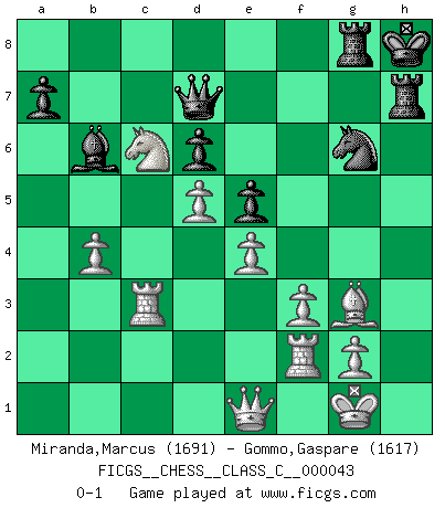 Last move : 0-1 2008 February 12 20:33:11 [Event "FICGS__CHESS__CLASS_C__000043"] [Site "FICGS"] [Date "2007.05.12"] [Round "1"] [White "Miranda,Marcus"] [Black "Gommo,Gaspare"] [Result "0-1"] [WhiteElo "1691"] [BlackElo "1617"] 1.d4 Nf6 2.c4 g6 3.Nc3 Bg7 4.e4 d6 5.Nf3 O-O 6.Be2 e5 7.O-O Nc6 8.d5 Ne7 9.Ne1 Nd7 10.Be3 f5 11.f3 f4 12.Bf2 g5 13.a4 Ng6 14.a5 Kh8 15.Nd3 Rg8 16.c5 Nf6 17.cxd6 cxd6 18.a6 bxa6 19.Nb4 h5 20.Nc6 Qd7 21.Bxa6 g4 22.b4 g3 23.hxg3 fxg3 24.Bxg3 h4 25.Bxc8 Qxc8 26.Bh2 Bh6 27.Kh1 Nh5 28.Qe1 Rg7 29.Ne2 Be3 30.Ra3 Bb6 31.Rc3 Qd7 32.Rf2 Ng3+ 33.Nxg3 hxg3 34.Bxg3 Rh7+ 35.Kg1 Rg8 0-1 King's Indian : Orthodox, Aronin-Taimanov variation (Yugoslav attack / Mar del Plata variation) Kingside Castling by player Black (move 5) Kingside Castling by player White (move 7) Player Black won this chess game. Follow this game move after move (download)At this time Fischer is simply a level above all the best Chessplayers in the world. (John Jacobs) Gott hat gewollt, dass ich Champion werde. (Surab Azmajparaschvili) Aquellos que dicen entender al Ajedrez, no entienden nada. (Robert Hubner) Il s'avisa de me proposer d'apprendre les échecs qu'il jouait un peu... me voilà forcené des échecs. J'achète un échiquier, je m'enferme dans ma chambre, j'y passe des jours et des nuits à vouloir apprendre par cur toutes les parties. (Jean-Jacques Rousseau, Confessions) Be who you are, and say what you feel because those who mind don't matter, and those who matter don't mind. (Dr Seuss)