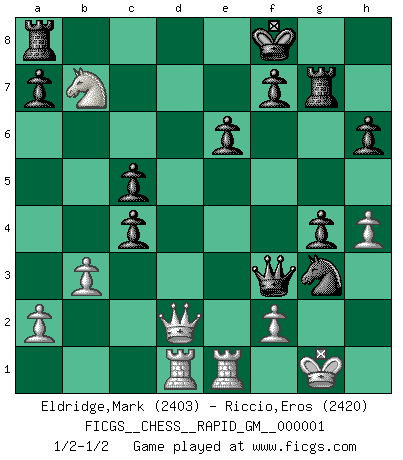 Last move : 1/2-1/2 2018 July 19 21:18:3 [Event "FICGS__CHESS__RAPID_GM__000001"] [Site "FICGS"] [Date "2018.07.03"] [Round "1"] [White "Eldridge,Mark"] [Black "Riccio,Eros"] [Result "1/2-1/2"] [WhiteElo "2403"] [BlackElo "2420"] 1.d4 d5 2.Nf3 Nf6 3.c4 e6 4.Nc3 c6 5.Bg5 h6 6.Bh4 dxc4 7.e4 g5 8.Bg3 b5 9.h4 g4 10.Ne5 Bb7 11.Be2 Nbd7 12.Nxd7 Qxd7 13.Be5 Qe7 14.O-O Rg8 15.b3 Bg7 16.Qc2 Nh5 17.Bxg7 Rxg7 18.g3 Qd6 19.e5 Qxd4 20.Rad1 Qxe5 21.Ne4 Kf8 22.Rfe1 c5 23.Bxc4 bxc4 24.Nd6 Qf6 25.Nxb7 Qf3 26.Qd2 Nxg3 1/2-1/2 Queen's pawn game Kingside Castling by player White (move 14) This chess game ended in a draw. Follow this game move after move (download)Half the variations which are calculated in a tournament game turn out to be completely superfluous. Unfortunately, no one knows in advance which half. (Jan Tinman) Drei Punkte vor allen anderen ist wie einer, der im weißen Anzug posiert, während der Rest in Müllsäcke gekleidet dasteht. (Viktor Kortschnoi) ¿Se han dado cuenta de que Fischer casi nunca ha tenido piezas malas? El las intercambia y las piezas malas se quedan con sus oponenets. (Yuri Balashov) Les échecs sont un jeu par leur forme, un art par leur essence et une science par sa difficulté d'acquisition. Ils peuvent vous procurer autant de plaisir qu'un bon livre ou une belle musique, mais vous n'aurez une réelle joie que si vous arrivez à bien jouer. (Tigran Petrosian) Difficult things take a long time, impossible things a little longer. (Author unknown)
