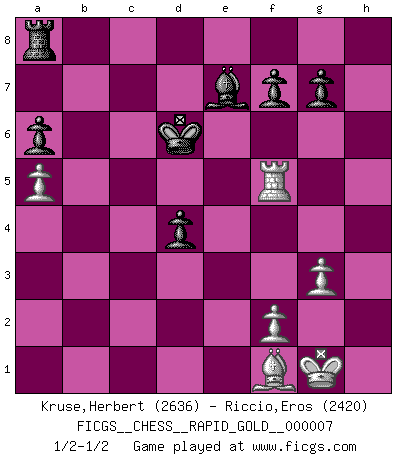 Last move : 1/2-1/2 2018 September 3 1:53:33 [Event "FICGS__CHESS__RAPID_GOLD__000007"] [Site "FICGS"] [Date "2018.07.04"] [Round "2"] [White "Kruse,Herbert"] [Black "Riccio,Eros"] [Result "1/2-1/2"] [WhiteElo "2636"] [BlackElo "2420"] 1.Nf3 c5 2.e4 d6 3.d4 cxd4 4.Nxd4 Nf6 5.Nc3 a6 6.h3 e5 7.Nde2 h5 8.g3 Be6 9.Bg2 b5 10.a4 b4 11.Nd5 Nxd5 12.exd5 Bf5 13.c3 bxc3 14.Nxc3 Be7 15.O-O Qc8 16.h4 Nd7 17.Be3 Qb7 18.a5 Rb8 19.Qe2 Qxb2 20.Qxb2 Rxb2 21.Rfc1 Nc5 22.Bxc5 dxc5 23.Re1 Bd3 24.Rxe5 Kd7 25.Re3 Bc2 26.Bf1 Ra8 27.Nd1 Rb4 28.Rc1 Bxd1 29.d6 Bxh4 30.Rxd1 Rd4 31.Rxd4 cxd4 32.Re5 Kxd6 33.Rxh5 Be7 34.Rf5 1/2-1/2 Reti Opening Kingside Castling by player White (move 15) This chess game ended in a draw. Follow this game move after move (download)Personally, I rather look forward to a computer program winning the world Chess Championship. Humanity needs a lesson in humility. (Richard Dawkings) Es gibt Leute, die glauben, alles wäre vernünftig, was man mit einem ernsthaften Gesicht tut. (Georg Christoph Lichtenberg) El Ajedrez es un regaderazo frío para la mente. (Sir John Simon) Toutes choses étant égales, c'est la conviction qui gagne. Alliée à une volonté de vaincre, elle sert de détonateur, suscite des idées, disperse les doutes et aide à penser clairement. (Robert Fischer) Train yourself to let go of everything you fear to lose. (Master Yoda in Star Wars ep.3)