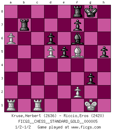 Last move : 1/2-1/2 2018 September 3 1:53:47 [Event "FICGS__CHESS__STANDARD_GOLD__000005"] [Site "FICGS"] [Date "2018.07.04"] [Round "2"] [White "Kruse,Herbert"] [Black "Riccio,Eros"] [Result "1/2-1/2"] [WhiteElo "2636"] [BlackElo "2420"] 1.Nf3 c5 2.e4 d6 3.d4 cxd4 4.Nxd4 Nf6 5.Nc3 a6 6.h3 e5 7.Nde2 h5 8.g3 Be6 9.Bg2 b5 10.a4 b4 11.Nd5 Nxd5 12.exd5 Bf5 13.c3 bxc3 14.Nxc3 Be7 15.O-O Qc8 16.h4 Nd7 17.Be3 Qb7 18.Qe2 Nf6 19.Rfc1 O-O 20.a5 Bd8 21.Qd2 Rb8 22.Bg5 Qxb2 23.Qxb2 Rxb2 24.Bf1 Rb8 25.Bxf6 Bxf6 26.Bxa6 g5 27.Be2 gxh4 28.Nb5 Bg4 29.Bxg4 Rxb5 30.Bd7 Rb7 31.Bf5 hxg3 32.a6 1/2-1/2 Reti Opening Kingside Castling by player White (move 15) Kingside Castling by player Black (move 19) This chess game ended in a draw. Follow this game move after move (download)Becoming successful at Chess allows you to discover your own personality. That's what I want for the kids I teach. (Saudin Robovic) Die größte Kunst beim Schach besteht darin dem Gegner nicht zu zeigen was er tun kann. (Garry Kasparov) El tablero es el mundo, las piezas es el fenomeno del universo, las reglas del juego son lo que llamamos leyes de la naturaleza y el jugador del lado opuesto, se encuentra oculto a nuestra vista. (Thomas Huxley) Si rien de grave n'est détecté lors de l'analyse d'une position, on joue alors le coup. Seconde règle de Blumenfeld. I've never seen so many men wasted so badly. (Blondie in The Good, The Bad and The Ugly)
