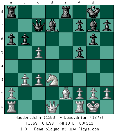 Last move : 1-0 2018 September 14 1:1:49 [Event "FICGS__CHESS__RAPID_E__000213"] [Site "FICGS"] [Date "2018.07.04"] [Round "1"] [White "Hadden,John"] [Black "Wood,Brian"] [Result "1-0"] [WhiteElo "1383"] [BlackElo "1277"] 1.d4 Nf6 2.Nc3 d5 3.Bg5 a6 4.e3 Nbd7 5.Nf3 g6 6.Be2 Bg7 7.Ne5 O-O 8.O-O c6 9.Nxd7 Nxd7 10.b3 Re8 11.e4 dxe4 12.Nxe4 Nf6 13.Bxf6 exf6 14.Nc5 b6 15.Na4 f5 16.c3 Bd7 17.Nb2 Qc7 18.Nd3 c5 19.dxc5 1-0 This chess game has been lost on time (started : 2018.07.04 22:58:6) Queen's pawn game Kingside Castling by player Black (move 7) Kingside Castling by player White (move 8) Player White won this chess game. Follow this game move after move (download)Spassky will not be psyched out by Fischer. (Mike Goodall) Ich war schon mal beim Dopingtest. Da musste ich Urin abgeben, während Dritte zusahen. (Elisabeth Pähtz) Los tropiezos estan todos ahí en el tablero, esperando que se cometan. (Savielly Tartakover) La menace est plus forte que l'exécution. (Aaron Nimzovitch) Without deviation from the norm, progress is not possible. (Frank Zappa)