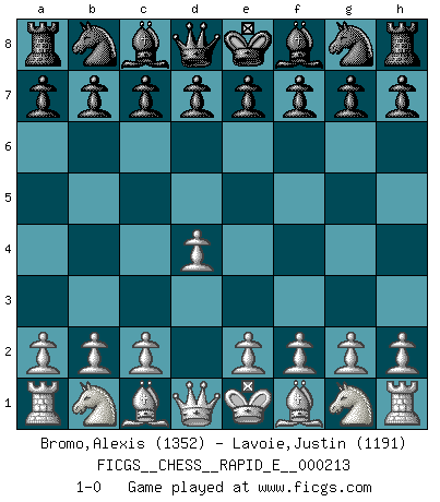 Last move : 1-0 2018 August 4 21:20:34 [Event "FICGS__CHESS__RAPID_E__000213"] [Site "FICGS"] [Date "2018.07.04"] [Round "1"] [White "Bromo,Alexis"] [Black "Lavoie,Justin"] [Result "1-0"] [WhiteElo "1352"] [BlackElo "1191"] 1.d4 1-0 This chess game has been lost on time (started : 2018.07.04 22:58:6) Queen's pawn Player White won this chess game. Follow this game move after move (download)War is the child of passion, passion is the child of narcissism and narcissism is the child. (...) Another game ? (Thibault de Vassal) Ich habe die besten Aussichten, den ersten Preis zu gewinnen - denn jeder muss gegen Steinitz spielen, nur ich nicht! (Wilhelm Steinitz) El estómago es una parte esencial del maestro de Ajedrez. (Bent Larsen) L'attaque fait le spectacle, la défense gagne les matchs. (Dicton footballistique) Hold em is to stud what chess is to checkers. (Johnny Moss)