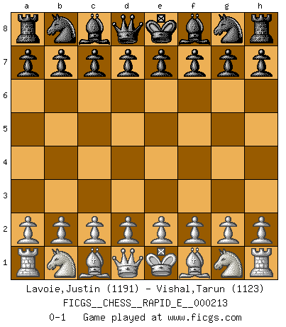 Last move : 0-1 2018 August 4 9:17:15 [Event "FICGS__CHESS__RAPID_E__000213"] [Site "FICGS"] [Date "2018.07.04"] [Round "1"] [White "Lavoie,Justin"] [Black "Vishal,Tarun"] [Result "0-1"] [WhiteElo "1191"] [BlackElo "1123"] 0-1 This chess game has been lost on time (started : 2018.07.04 22:58:6) Player Black won this chess game. Follow this game move after move (download)Bobby is the most misunderstood, misquoted celebrity walking the face of this earth. (Yasser Seirawan) Wenn es im Universum noch irgendwo intelligente Lebewesen gibt, dann kennen sie Go. (Emanuel Lasker) Bobby Fischer es el mas grande genio de Ajedrez de todos los tiempos. (Alexander Kotov) Les réformistes prétendent que les progrès de la théorie conduiront à la disparition des échecs, et qu'il faut, pour leur rendre vie, en remanier les règles. En réalité, qu'exprime cette affirmation? Le mépris de l'intuition, de l'imagination et de tous les autres éléments qui font des échecs un art. (Alexander Alekhine) Luck has a peculiar habit of favoring those who don't depend on it. (Author unknown)
