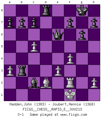 Last move : 0-1 2018 August 17 10:7:8 [Event "FICGS__CHESS__RAPID_E__000213"] [Site "FICGS"] [Date "2018.07.04"] [Round "1"] [White "Hadden,John"] [Black "Joubert,Hennie"] [Result "0-1"] [WhiteElo "1383"] [BlackElo "1368"] 1.d4 Nf6 2.Nf3 g6 3.c4 Bg7 4.e3 O-O 5.Nc3 d6 6.Bd3 e5 7.dxe5 dxe5 8.Bd2 Qxd3 9.Nxe5 Qd6 10.f4 Bf5 11.O-O Nc6 12.Nxc6 Qxc6 13.b3 Ne4 14.Nxe4 Bxa1 15.Qxa1 Bxe4 16.Qd4 Bxg2 17.Rf2 Rad8 18.Qc3 Be4 19.Qb2 Rd3 20.a3 Rfd8 21.Kf1 Qe6 22.c5 Rxb3 23.Qc2 Bxc2 0-1 King's Indian : East Indian defense Kingside Castling by player Black (move 4) Kingside Castling by player White (move 11) Player Black won this chess game. Follow this game move after move (download)Capture of the adverse King is the ultimate but not the first object of the game. (William Steinitz) Nur ein wirklich starker Spieler weiß wie schwach er spielt. (Savielly Grigorievitsch Tartakower) Yo jugué Ajedrez con el y a veces le pude haber ganado solo que siempre devuelve su última jugada y juega la partida de manera diferente. (Mark Twain) Les Echecs sont affaire de jugement sensible. Savoir quand frapper et quand esquiver. (Fischer) Success without honor is an unseasoned dish; it will satisfy your hunger, but it won't taste good. (Joe Paterno)