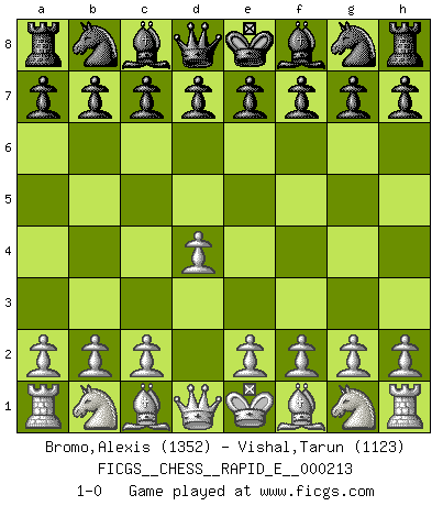 Last move : 1-0 2018 August 4 21:20:34 [Event "FICGS__CHESS__RAPID_E__000213"] [Site "FICGS"] [Date "2018.07.04"] [Round "1"] [White "Bromo,Alexis"] [Black "Vishal,Tarun"] [Result "1-0"] [WhiteElo "1352"] [BlackElo "1123"] 1.d4 1-0 This chess game has been lost on time (started : 2018.07.04 22:58:6) Queen's pawn Player White won this chess game. Follow this game move after move (download)When you don't know what to play, wait for an idea to come into your opponent's mind. You may be sure that idea will be wrong. (Siegbert Tarrasch) Es gibt nur zwei wahre Schachgenies - das andere war Wilhelm Steinitz, der Weltmeister von 1872 bis 1894. (Robert James Fischer) Solo los afeminados hacen el Enroque. (Rob Sillars) Pour moi, les échecs ne sont pas un jeu mais un art. (Alexandre Alekhine) Wisdom doesn't necessarily come with age. Sometimes age just shows up all by itself. (Tom Wilson)