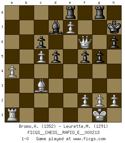 Last move : 1-0 2018 July 21 13:43:19 [Event "FICGS__CHESS__RAPID_E__000213"] [Site "FICGS"] [Date "2018.07.04"] [Round "1"] [White "Bromo,Alexis"] [Black "Leurette,Marc-Antoine"] [Result "1-0"] [WhiteElo "1352"] [BlackElo "1291"] 1.d4 d5 2.c4 e6 3.Nc3 Nf6 4.Nf3 c6 5.c5 b6 6.b4 Be7 7.e3 O-O 8.Bd3 b5 9.O-O a5 10.bxa5 Rxa5 11.Bd2 Ra8 12.Re1 h6 13.e4 dxe4 14.Nxe4 Nbd7 15.Bc2 Nd5 16.Ne5 Nxe5 17.dxe5 f5 18.Nd6 Bxd6 19.exd6 Bd7 20.Bb3 Re8 21.a4 b4 22.Bxd5 exd5 23.Bxb4 g5 24.Qd4 Kh7 25.Bc3 Rg8 26.Re7+ Qxe7 27.dxe7 Rae8 28.Qf6 1-0 QGD Semi-Slav Kingside Castling by player Black (move 7) Kingside Castling by player White (move 9) Player White won this chess game. Follow this game move after move (download)In Chess, just as in life, today's bliss may be tomorrow's poison. (Assaic) Verschiedene, sehr schätzbare und im Laufe des Lebens nützliche Eigenschaften des Geistes können durch das Schachspiel erworben und gekräftigt werden, so dass sie zu Gewohnheiten werden, die uns nie im Stich lassen. (Benjamin Franklin) Un mal plan es mejor que no tener ningún plan. (Frank Marshall) Toutes choses étant égales, c'est la conviction qui gagne. Alliée à une volonté de vaincre, elle sert de détonateur, suscite des idées, disperse les doutes et aide à penser clairement. (Robert Fischer) Looking at the proliferation of personal web pages on the Net, it looks like very soon everyone on Earth will have 15 megabytes of fame. (M.G. Sriram)
