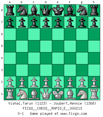 Last move : 0-1 2018 August 4 9:17:15 [Event "FICGS__CHESS__RAPID_E__000213"] [Site "FICGS"] [Date "2018.07.04"] [Round "1"] [White "Vishal,Tarun"] [Black "Joubert,Hennie"] [Result "0-1"] [WhiteElo "1123"] [BlackElo "1368"] 0-1 This chess game has been lost on time (started : 2018.07.04 22:58:6) Player Black won this chess game. Follow this game move after move (download)There's never before been a Chess player with such a thorough knowledge of the intricacies of the game and such an absolutely indomitable will to win. I think Bobby is the greatest player that ever lived. (Lisa Lane) Besser ein falscher Plan, logisch durchgeführt, als gar kein Plan. (Viktor Kortschnoi) Tu no necesitas jugar muy bien, únicamente ayudar a tu oponenet a que juegue muy mal. (Genrikh Chepukaitis) Il (Jacob Murray) ne joue pas pour le bon coup, mais pour le meilleur. (Eloi Relange) I just play for fun. (Anna Kournikova)