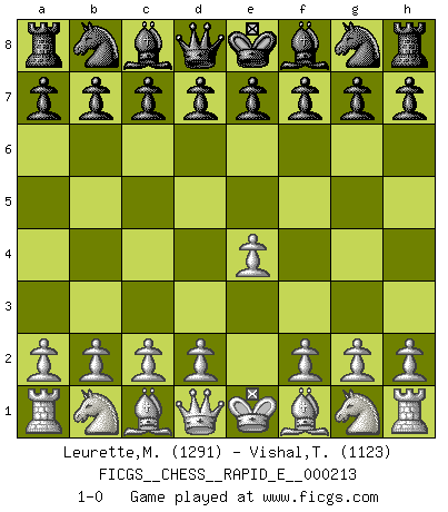 Last move : 1-0 2018 August 4 9:17:15 [Event "FICGS__CHESS__RAPID_E__000213"] [Site "FICGS"] [Date "2018.07.04"] [Round "1"] [White "Leurette,Marc-Antoine"] [Black "Vishal,Tarun"] [Result "1-0"] [WhiteElo "1291"] [BlackElo "1123"] 1.e4 1-0 This chess game has been lost on time (started : 2018.07.04 22:58:6) King's pawn Opening Player White won this chess game. Follow this game move after move (download)Later, I began to succeed in decisive games. Perhaps because I realized a very simple truth: not only was I worried, but also my opponent. (Mikhail Tal) Es liegt in der Natur, vernüftig zu denken und unlogisch zu handeln. (Anatole France) El Ajedrez tiene tanto misterio como las mujeres. (Purdy) Un millionnaire : 'Monsieur Steinitz ! Vous ne participez aux tournois que pour l'argent, alors que moi je n'y viens que pour l'honneur.' Steinitz : 'Chacun joue pour ce qu'il n'a pas'... Have no fear of perfection - you'll never reach it. (Salvador Dali)