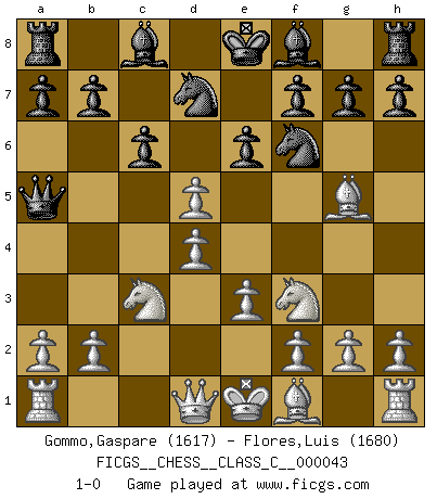 Last move : 1-0 2007 July 18 11:33:14 [Event "FICGS__CHESS__CLASS_C__000043"] [Site "FICGS"] [Date "2007.05.12"] [Round "1"] [White "Gommo,Gaspare"] [Black "Flores,Luis"] [Result "1-0"] [WhiteElo "1617"] [BlackElo "1680"] 1.d4 d5 2.c4 e6 3.Nc3 Nf6 4.Nf3 c6 5.Bg5 Nbd7 6.e3 Qa5 7.cxd5 1-0 This chess game has been lost on time (started : 2007.05.12 21:50:33) QGD Semi-Slav Player White won this chess game. Follow this game move after move (download)The Chess pieces are the block alphabet which shapes thoughts; and these thoughts, although making a visual design on the chessboard, express their beauty abstractly, like a poem. (Marcel Duchamp) Privat ist Kortschnoi kein schlechter Mensch, sehr sympathisch. Aber während des Spiels ist er grausam. Er will dich töten. (Miguel Najdorf) Cada Peón es potencialmente una Reina. (James Mason) Toutes les manuvres exécutées sur une colonne ouverte ont pour but ultime l'intrusion définitive sur la septième ou la huitième rangée, en plein cur de la position ennemie. (Aaron Nimzovitch) If you are good, you will be assigned all the work. If you are really good, you will get out of it. (Dan Rotaru)