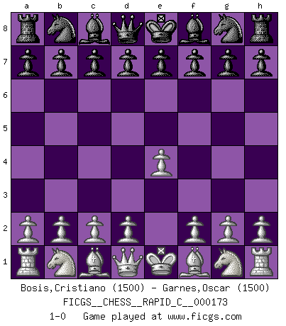 Last move : 1-0 2018 August 18 22:48:53 [Event "FICGS__CHESS__RAPID_C__000173"] [Site "FICGS"] [Date "2018.07.05"] [Round "1"] [White "Bosis,Cristiano"] [Black "Garnes,Oscar"] [Result "1-0"] [WhiteElo "1500"] [BlackElo "1500"] 1.e4 1-0 This chess game has been lost on time (started : 2018.07.05 15:21:31) King's pawn Opening Player White won this chess game. Follow this game move after move (download)Avoid the crowd. Do your own thinking independently. Be the Chess player, not the Chess piece. (Ralph Charell) Eine Person mit durchschnittlichem IQ kann etwa eine ELO von 2000 erreichen. (Jonathan Levitt) Ayuda a tus piezas para que ellas te puedan ayudar. (Paul Morphy) Le plus grand jeu de l'esprit jamais inventé, plus vous l'apprenez, plus vous y prenez du plaisir. (Garry Kasparov) Thibault, I ask for draw. Game 13876. - Sorry Ilmars, you won. (FICGS chat)