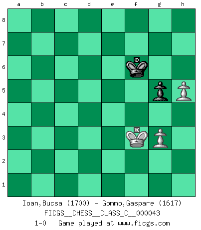 Last move : 1-0 2008 January 23 18:34:25 [Event "FICGS__CHESS__CLASS_C__000043"] [Site "FICGS"] [Date "2007.05.12"] [Round "1"] [White "Ioan,Bucsa"] [Black "Gommo,Gaspare"] [Result "1-0"] [WhiteElo "1700"] [BlackElo "1617"] 1.c4 e5 2.Nc3 Nf6 3.Nf3 Nc6 4.g3 d5 5.cxd5 Nxd5 6.Bg2 Nb6 7.O-O Be7 8.a3 a5 9.d3 O-O 10.Be3 Be6 11.Na4 Nd5 12.Nc5 Nxe3 13.Nxe6 Qd6 14.fxe3 Qxe6 15.Rc1 e4 16.Nd4 Nxd4 17.exd4 exd3 18.Qxd3 c6 19.e4 Rfd8 20.Qc3 Rd7 21.Kh1 Bf6 22.e5 Bg5 23.Rcd1 Rad8 24.h4 Be7 25.Kh2 f5 26.b4 a4 27.Rd3 h6 28.b5 cxb5 29.d5 Rxd5 30.Rxd5 Rxd5 31.Bxd5 Qxd5 32.Qc8+ Qd8 33.Qxb7 Qd3 34.Qc8+ Kh7 35.Qxf5+ Qxf5 36.Rxf5 Kg6 37.Rf3 h5 38.e6 b4 39.axb4 Bxb4 40.Rf4 Be7 41.Rxa4 Kf5 42.Ra5+ Kf6 43.Rxh5 Kxe6 44.Kh3 Bd6 45.Rb5 Be5 46.Rxe5+ Kxe5 47.Kg4 Kf6 48.h5 g5 49.Kf3 1-0 English Opening Kingside Castling by player White (move 7) Kingside Castling by player Black (move 9) 10 pieces endgame at move 39 : White KRPPP , Black KBPPP WHITE : King + 1 Rook 3 Pawns BLACK : King + 1 Bishop 3 Pawns 9 pieces endgame at move 41 : White KRPPP , Black KBPP WHITE : King + 1 Rook 3 Pawns BLACK : King + 1 Bishop 2 Pawns 8 pieces endgame at move 43 : White KRPPP , Black KBP WHITE : King + 1 Rook 3 Pawns BLACK : King + 1 Bishop 1 Pawn 7 pieces endgame at move 43 : White KRPP , Black KBP WHITE : King + 1 Rook 2 Pawns BLACK : King + 1 Bishop 1 Pawn 6 pieces endgame at move 46 : White KRPP , Black KP WHITE : King + 1 Rook 2 Pawns BLACK : King + 1 Pawn 5 pieces endgame at move 46 : White KPP , Black KP WHITE : King + 2 Pawns BLACK : King + 1 Pawn Player White won this chess game. Follow this game move after move (download)There is no remorse like the remorse of Chess. (H. G. Wells) Du kannst im Schach nur gut werden, wenn du das Spiel liebst. (Robert James Fischer) Hasta este punto, las blancas han seguido un análisis bien conocido. Pero ahora el hace un error fatal: empieza a usar su propia cabeza. (Siegbert Tarrasch) Il n'y a pas de prix trop élevé au scalp de l'ennemi. (Koblentz) All art requires courage. (Anne Tucker)