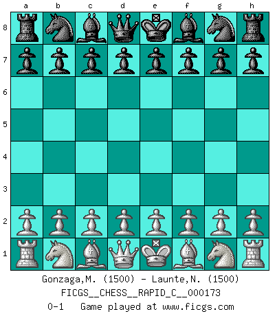 Last move : 0-1 2018 August 4 21:20:34 [Event "FICGS__CHESS__RAPID_C__000173"] [Site "FICGS"] [Date "2018.07.05"] [Round "1"] [White "Gonzaga,Markjohnpaul"] [Black "Launte,Nekamorak"] [Result "0-1"] [WhiteElo "1500"] [BlackElo "1500"] 0-1 This chess game has been lost on time (started : 2018.07.05 15:21:31) Player Black won this chess game. Follow this game move after move (download)Bobby Fischer is the greatest Chess genius of all time ! (Alexander Kotov) Karpov ist ein Museumsstück. (Garry Kasparov) Desconfianza es la característica mas necesaria de un jugador de Ajedrez. (Siegbert Tarrasch) Ce n'est pas pour s'amuser qu'il joue aux échecs : il célèbre un culte. (Vladimir Nabokov) You can't play chess if you're groggy from pills. (Anatoly Karpov)