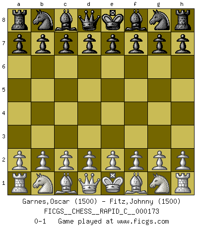 Last move : 0-1 2018 August 4 21:20:34 [Event "FICGS__CHESS__RAPID_C__000173"] [Site "FICGS"] [Date "2018.07.05"] [Round "1"] [White "Garnes,Oscar"] [Black "Fitz,Johnny"] [Result "0-1"] [WhiteElo "1500"] [BlackElo "1500"] 0-1 This chess game has been lost on time (started : 2018.07.05 15:21:31) Player Black won this chess game. Follow this game move after move (download)It is not a move, even the best move that you must seek, but a realizable plan. (Eugene Znosko-Borovsky) Dass jemand wie Surab Asmaiparaschwili, der selbst Elopunkte gekauft hat , Vize-Präsident der Fide werden konnte, sagt schon einges über den Zustand dieser Organisation aus. (Joel Lautier) Un buen jugador siempre tiene buena suerte. (José Raúl Capablanca) La menace est plus forte que l'exécution. (Aaron Nimzovitch) When you stop learning you start dying. (M. Scott Adams)