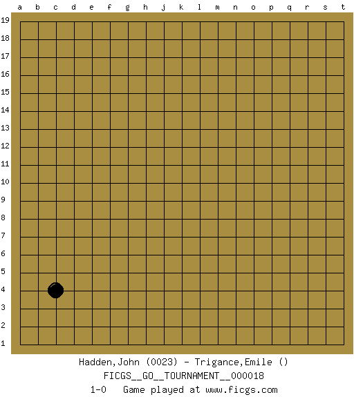 Last move : 1-0 2018 July 8 21:0:52 [Event "FICGS__GO__TOURNAMENT__000018"] [Site "FICGS"] [Date "2018.07.06"] [Round "1"] [Black "Hadden,John"] [White "Trigance,Emile"] [Result "1-0"] [Rating 1 "0023"] 1.c4 1-0 Here are the names of the openings (joseki) played in the four corners : Corner d4 : c4 1-0 Komoku (Somok, Xiao~mu`) 3-4 Point. The komoku (3-4) point is the traditional corner enclosure move.. Player Black won this Go (weiqi, baduk) game. Follow this game move after move (download)If White takes all four corners, Black should resign; if Black takes all four corners, Black should also resign. (David Kent) 'preceded by its own quotation yields a falsehood' preceded by its own quotation yields a falsehood. (W. V. O. Quine - Set Theory And Its Logic, 1953)