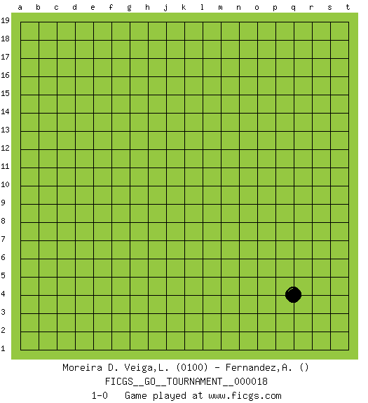 Last move : 1-0 2018 August 6 9:37:52 [Event "FICGS__GO__TOURNAMENT__000018"] [Site "FICGS"] [Date "2018.07.06"] [Round "1"] [Black "Moreira D. Veiga,Ludovic"] [White "Fernandez,Andres"] [Result "1-0"] [Rating 1 "0100"] 1.q4 1-0 This go game has been lost on time (started : 2018.07.06 23:5:53) Here are the names of the openings (joseki) played in the four corners : Corner q4 : q4 1-0 Hoshi (Hwajeom, Seongjeom, Xingwei`) 4-4 Point. The star or hoshi (4-4) point, emphasizing influence at the potential expense of territory. Player Black won this Go (weiqi, baduk) game. Follow this game move after move (download)Don't disturb symmetry. (Anonymous) We cannot be sure of having something to live for unless we are willing to die for it. (Ernesto Che Guevara)