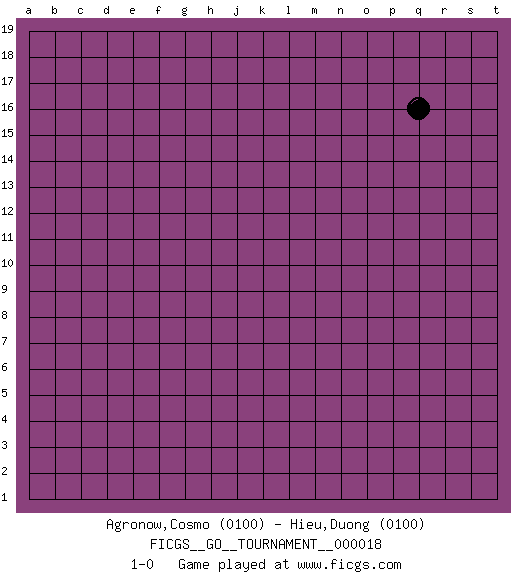 Last move : 1-0 2018 August 6 9:37:52 [Event "FICGS__GO__TOURNAMENT__000018"] [Site "FICGS"] [Date "2018.07.06"] [Round "1"] [Black "Agronow,Cosmo"] [White "Hieu,Duong"] [Result "1-0"] [Rating 1 "0100"] [Rating 2 "0100"] 1.q16 1-0 This go game has been lost on time (started : 2018.07.06 23:5:53) Here are the names of the openings (joseki) played in the four corners : Player Black won this Go (weiqi, baduk) game. Follow this game move after move (download)Every move brings change. (Pierre Audouard) Dave, my mind is going. I can feel it. (HAL 9000 in 2001, a space odyssey)