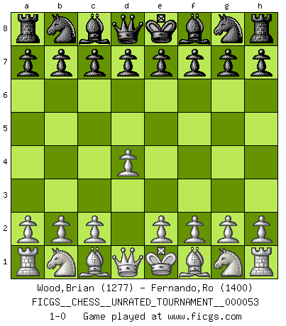 Last move : 1-0 2018 August 16 10:42:45 [Event "FICGS__CHESS__UNRATED_TOURNAMENT__000053"] [Site "FICGS"] [Date "2018.07.07"] [Round "1"] [White "Wood,Brian"] [Black "Fernando,Ro"] [Result "1-0"] [WhiteElo "1277"] [BlackElo "1400"] 1.d4 1-0 This chess game has been lost on time (started : 2018.07.07 3:42:46) Queen's pawn Player White won this chess game. Follow this game move after move (download)Chess is the gymnasium of the mind. (Blaise Pascal) Im Schach gibt es keinen Platz für Galanterie. (Irving Chernev) Cuando la partida de Ajedrez termina, el Peón y el Rey regresan a la misma caja. (Irish saying) Le système Elo représente seulement une moyenne. Il est simplement un indicateur de votre stabilité. (Anatoli Karpov) The general who wins the battle makes many calculations in his temple before the battle is fought. The general who loses makes but few calculations beforehand. (Sun Tzu)