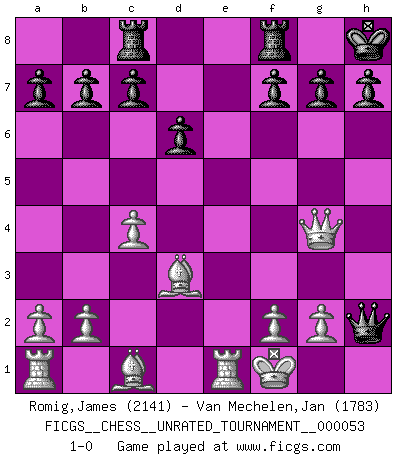 Last move : 1-0 2018 July 27 13:1:10 [Event "FICGS__CHESS__UNRATED_TOURNAMENT__000053"] [Site "FICGS"] [Date "2018.07.07"] [Round "1"] [White "Romig,James"] [Black "Van Mechelen,Jan"] [Result "1-0"] [WhiteElo "2141"] [BlackElo "1783"] 1.c4 e5 2.Nf3 e4 3.Nd4 Nc6 4.e3 Nxd4 5.exd4 Qf6 6.Be2 Qxd4 7.Nc3 Nf6 8.O-O Be7 9.d3 exd3 10.Bxd3 Qh4 11.Re1 Ng4 12.Qf3 Qxh2+ 13.Kf1 d6 14.Nd5 O-O 15.Nxe7+ Kh8 16.Nxc8 Raxc8 17.Qxg4 1-0 English, Nimzovich, Flohr variation Kingside Castling by player White (move 8) Kingside Castling by player Black (move 14) Player White won this chess game. Follow this game move after move (download)A big shock; the best chess player in history has passed away. (Lajos Portisch, about Bobby Fischer's death) Ich organisiere ein großes Turnier, was mich etwa 120000 Dollar kostet. Ich denke, das ist das erste Mal in der Schachgeschichte, daß ein Schachgroßmeister auch als Mäzen auftritt. (Miguel Najdorf) Dejen al perfeccionista jugar por correo. (Yasser Seirawan) Les échecs, c'est l'art d'analyser. (Mikhail Botvinnik) All politicians must be presumed guilty until they are proven innocent. (Dinesh De Silva)