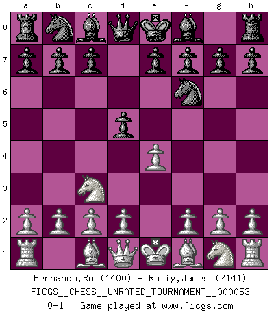 Last move : 0-1 2018 August 16 10:30:55 [Event "FICGS__CHESS__UNRATED_TOURNAMENT__000053"] [Site "FICGS"] [Date "2018.07.07"] [Round "1"] [White "Fernando,Ro"] [Black "Romig,James"] [Result "0-1"] [WhiteElo "1400"] [BlackElo "2141"] 1.e4 Nf6 2.Nc3 d5 0-1 This chess game has been lost on time (started : 2018.07.07 3:42:46) Alekhine's defense : Scandinavian variation Player Black won this chess game. Follow this game move after move (download)Chess is thirty to forty percent psychology. You don't have this when you play a computer. I can't confuse it. (Judith Polgar) Das Blackmar-Diemer-Gambit verändert den ganzen Menschen! (Emil Joseph Diemer) Me gusta decir que Bobby Fischer fue el mejor jugador que jamás haya existido. Pero lo que hizo de Fischer un genio, fue su habilidad de mezclar una frescura y pragmatismo Americano con ideas Rusas acerca de la estrategia. (Bruce Pandolfini) Toute estimation doit être constamment réévaluée. (Jacob Estrin) Drag your thoughts away from your troubles... by the ears, by the heels, or any other way you can manage it. (Mark Twain)