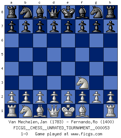 Last move : 1-0 2018 August 16 22:44:28 [Event "FICGS__CHESS__UNRATED_TOURNAMENT__000053"] [Site "FICGS"] [Date "2018.07.07"] [Round "1"] [White "Van Mechelen,Jan"] [Black "Fernando,Ro"] [Result "1-0"] [WhiteElo "1783"] [BlackElo "1400"] 1.Nf3 1-0 This chess game has been lost on time (started : 2018.07.07 3:42:46) Reti Opening Player White won this chess game. Follow this game move after move (download)Only sissies Castle. (Rob Sillars) Ich könnte leicht behaupten: Ja,ja, Leonid Breschnew wollte nicht, daß ich Weltmeister werde. In der Tat war die Sache komplizierter. (Viktor Kortschnoi) Diferente gente reacciona diferentemente en aceptar la derrota. (Bobby Fischer) Si le désir cupide (et stupide) de gagner est une inépuisable source de souffrance, une combinaison brillante sur l'échiquier est une découverte : le coquelicot qui s'épanouit lorsque apparaît la Voie Lactée. (Arrabal) History is a gallery of pictures in which there are few originals and many copies. (Alexis de Tocqueville)