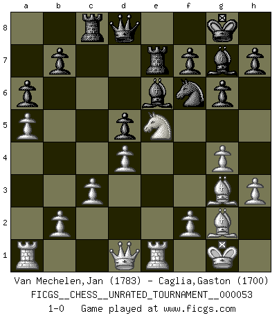 Last move : 1-0 2018 October 11 20:11:51 [Event "FICGS__CHESS__UNRATED_TOURNAMENT__000053"] [Site "FICGS"] [Date "2018.07.07"] [Round "1"] [White "Van Mechelen,Jan"] [Black "Caglia,Gaston"] [Result "1-0"] [WhiteElo "1783"] [BlackElo "1700"] 1.Nf3 Nf6 2.g3 g6 3.Bg2 Bg7 4.O-O c6 5.d3 O-O 6.e4 d6 7.Nbd2 e5 8.a4 a6 9.a5 Nbd7 10.Nc4 Re8 11.Re1 d5 12.exd5 cxd5 13.Ncxe5 Nxe5 14.Nxe5 Qc7 15.d4 Bf5 16.c3 Re7 17.Bf4 Qd8 18.g4 Be6 19.h3 Rc8 20.Bg3 1-0 This chess game has been lost on time (started : 2018.07.07 3:42:46) Reti : King's Indian attack Kingside Castling by player White (move 4) Kingside Castling by player Black (move 5) Player White won this chess game. Follow this game move after move (download)Who is your opponent tonight, tonight I am playing against the Black pieces. (Akiba Rubinstein) Unter Putin wird alles Geld aus Russland wie von einem Staubsauger nach Moskau umgeleitet, das ist wie ein schwarzes Loch. (Garry Kasparov) De eso se trata el Ajedrez. Un día le das una lección a tu oponente y al día siguiente el te da una a tí. (Bobby Fischer) Avec des compensations pour le matériel en plus... (Anonyme) A person who never made a mistake never tried anything new. (Albert Einstein)