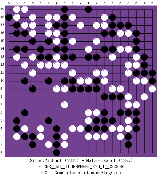 Last move : 1-0 2018 October 29 19:33:38 [Event "FICGS__GO__TOURNAMENT_KYU_I__000080"] [Site "FICGS"] [Date "2018.07.07"] [Round "1"] [Black "Simon,Mickael"] [White "Walzer,Karel"] [Result "1-0"] [Rating 1 "1339"] [Rating 2 "1357"] 1.r16 c4 2.q3 d16 3.p17 e3 4.r5 q4 5.r4 q5 6.q6 o4 7.c14 c12 8.e14 f16 9.g14 k17 10.c10 d11 11.d9 f12 12.c6 p3 13.q2 q16 14.q17 p16 15.o16 q14 16.r15 p14 17.b16 c17 18.b17 n17 19.o17 r10 20.b4 b3 21.b5 j4 22.n16 m17 23.f10 h12 24.j13 j11 25.j9 k10 26.k9 l10 27.l9 n10 28.h17 g18 29.g17 f17 30.h18 f18 31.c18 d18 32.c16 d17 33.n14 l14 34.l13 j15 35.h15 j18 36.h19 b18 37.a18 c19 38.m13 n18 39.m10 m11 40.m9 n11 41.g3 h3 42.g4 f2 43.g2 h2 44.g1 l3 45.d2 r7 46.r6 q7 47.p6 n5 48.o5 p4 49.n4 n3 50.m4 m3 51.l4 k4 52.n6 l5 53.m5 m6 54.n5 l6 55.n8 o9 56.o8 p9 57.p8 q8 58.s12 r12 59.s13 r13 60.s11 s10 61.r11 q11 62.r14 q12 63.t10 t9 64.t11 s8 65.c3 h7 66.d3 e4 67.f5 h9 68.h10 g9 69.j10 g13 70.h13 g16 71.h16 b13 72.b14 f14 73.d15 g15 74.h14 d13 75.e13 e12 76.f13 g12 77.f15 b19 78.o18 m15 79.o14 o13 80.l19 1-0 Here are the names of the openings (joseki) played in the four corners : Corner d16 : d16 c14 Hoshi (Hwajeom, Seongjeom, Xingwei`) 4-4 Point. The star or hoshi (4-4) point, emphasizing influence at the potential expense of territory. Ikken Kakari (Hankan Keolch'im, Yi Gua`jiao~, 1-Space Low Approach). Black 2 is the standard approach move to the 4-4. Player Black won this Go (weiqi, baduk) game. Follow this game move after move (download)Add one stone, then sacrifice both. (Anonymous) The human is the only animal species whose members are able to talk themselves into difficulties that would not otherwise exist. (Wendell Johnson)