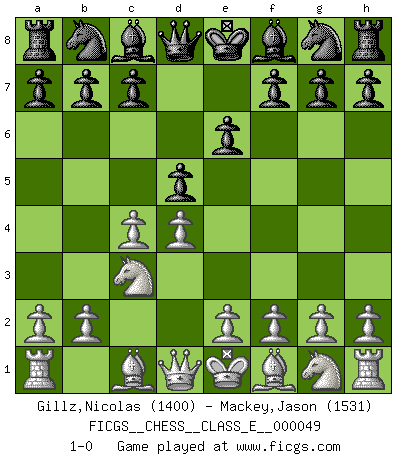 Last move : 1-0 2007 June 24 2:40:25 [Event "FICGS__CHESS__CLASS_E__000049"] [Site "FICGS"] [Date "2007.05.14"] [Round "1"] [White "Gillz,Nicolas"] [Black "Mackey,Jason"] [Result "1-0"] [WhiteElo "1400"] [BlackElo "1531"] 1.d4 d5 2.c4 e6 3.Nc3 1-0 This chess game has been lost on time (started : 2007.05.14 2:1:18) QGD : 3.Nc3 Player White won this chess game. Follow this game move after move (download)If your opponent offers you a draw, try to work out why he thinks he's worse off. (Nigel Short) Nach Morphy wurde nichts neues mehr in der Behandlung offener Positionen gefunden. (Mikhail Moiseyevich Botvinik) Me siento como si fuera una pieza en una partida de Ajedrez, cuando mi oponente me indica: esa pieza no puede ser movida. (Soren Kierkegaard) La menace est plus forte que l'exécution. (Aaron Nimzovitch) Don't anthropomorphize computers - they hate it. (Anonymous)