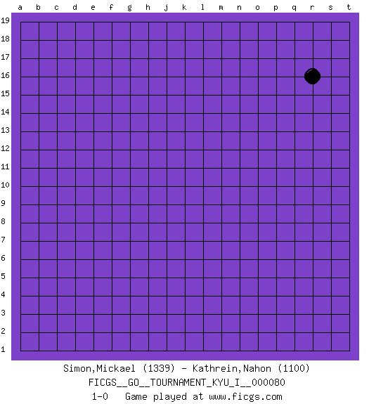 Last move : 1-0 2018 August 8 9:52:43 [Event "FICGS__GO__TOURNAMENT_KYU_I__000080"] [Site "FICGS"] [Date "2018.07.07"] [Round "1"] [Black "Simon,Mickael"] [White "Kathrein,Nahon"] [Result "1-0"] [Rating 1 "1339"] [Rating 2 "1100"] 1.r16 1-0 This go game has been lost on time (started : 2018.07.07 14:28:58) Here are the names of the openings (joseki) played in the four corners : Player Black won this Go (weiqi, baduk) game. Follow this game move after move (download)Don't make dango's. (Anonymous) Horse racing is animated roulette. (Roger Kahn)