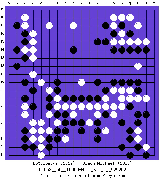 Last move : 1-0 2018 October 26 0:27:59 [Event "FICGS__GO__TOURNAMENT_KYU_I__000080"] [Site "FICGS"] [Date "2018.07.07"] [Round "1"] [Black "Lot,Sosuke"] [White "Simon,Mickael"] [Result "1-0"] [Rating 1 "1217"] [Rating 2 "1339"] 1.q16 d4 2.q4 d16 3.f3 c6 4.k4 o17 5.r14 q18 6.r6 f17 7.d7 c7 8.d9 r17 9.q10 r3 10.q3 r4 11.r5 q2 12.p2 s2 13.q1 r1 14.r2 r8 15.s1 p8 16.c8 h3 17.f5 h5 18.c3 d3 19.c4 d5 20.d2 e2 21.c2 e3 22.f2 e1 23.f7 f4 24.g4 e4 25.g3 g5 26.h4 f6 27.j5 h7 28.g6 e5 29.h6 g7 30.f5 g5 31.f8 r12 32.r9 s8 33.o16 d11 34.p17 p18 35.n17 o18 36.m15 s15 37.s14 r15 38.q14 q15 39.p14 p15 40.o14 o15 41.n15 p16 42.c16 c17 43.c15 d15 44.b17 c18 45.c13 c14 46.b14 d14 47.b12 d13 48.c10 o7 49.o10 q9 50.r10 m7 51.m10 n4 52.m3 j17 53.j14 k10 54.l8 l7 55.k8 j6 56.h5 k7 57.j8 j7 58.h8 g8 59.g9 f9 60.g10 e10 61.m8 n8 62.n9 o9 63.p10 p9 64.q7 q8 65.n6 o6 66.m5 n7 67.s6 p7 68.p5 l5 69.m4 m6 70.k5 1-0 Here are the names of the openings (joseki) played in the four corners : Corner d4 : d4 f3 Hoshi (Hwajeom, Seongjeom, Xingwei`) 4-4 Point. The star or hoshi (4-4) point, emphasizing influence at the potential expense of territory. Ikken Kakari (Hankan Keolch'im, Yi Gua`jiao~, 1-Space Low Approach). Black 2 is the standard approach move to the 4-4. Corner q16 : q16 o17 Hoshi (Hwajeom, Seongjeom, Xingwei`) 4-4 Point. The star or hoshi (4-4) point, emphasizing influence at the potential expense of territory. Ikken Kakari (Hankan Keolch'im, Yi Gua`jiao~, 1-Space Low Approach). White 2 is the standard approach move to the 4-4. Player Black won this Go (weiqi, baduk) game. Follow this game move after move (download)Six eyes in a rectangle are alive. (Anonymous) There is a great deal of difference between an eager man who wants to read a book and a tired man who wants a book to read. (G.K. Chesterton)