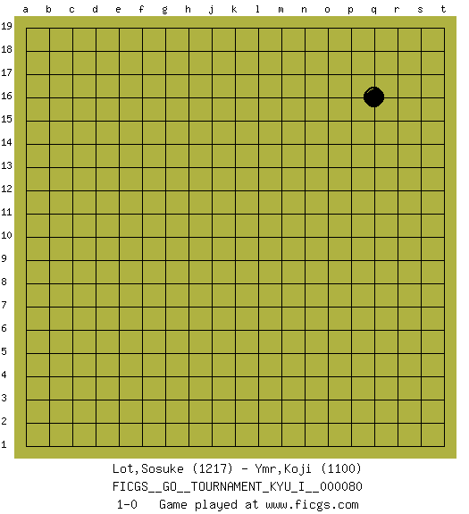 Last move : 1-0 2018 August 6 21:38:9 [Event "FICGS__GO__TOURNAMENT_KYU_I__000080"] [Site "FICGS"] [Date "2018.07.07"] [Round "1"] [Black "Lot,Sosuke"] [White "Ymr,Koji"] [Result "1-0"] [Rating 1 "1217"] [Rating 2 "1100"] 1.q16 1-0 This go game has been lost on time (started : 2018.07.07 14:28:58) Here are the names of the openings (joseki) played in the four corners : Player Black won this Go (weiqi, baduk) game. Follow this game move after move (download)Josekis are not fixed, definitive things. They indicate the moments when everything can change. (Pierre Audouard) However beautiful the strategy, you should occasionally look at the results. (Winston Churchill)