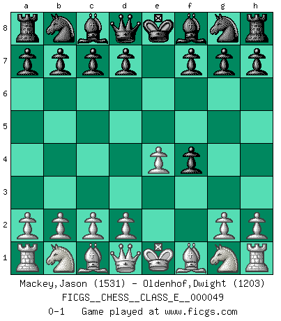 Last move : 0-1 2007 June 25 2:49:15 [Event "FICGS__CHESS__CLASS_E__000049"] [Site "FICGS"] [Date "2007.05.14"] [Round "1"] [White "Mackey,Jason"] [Black "Oldenhof,Dwight"] [Result "0-1"] [WhiteElo "1531"] [BlackElo "1203"] 1.e4 e5 2.f4 exf4 0-1 This chess game has been lost on time (started : 2007.05.14 2:1:18) King's gambit accepted Player Black won this chess game. Follow this game move after move (download)By the beauty of his games, the clarity of his play, and the brilliance of his ideas, Fischer made himself an artist of the same stature as Brahms, Rembrandt, and Shakespeare. (David Levy) Ein Remis kann durch Wiederholung von drei Zügen oder durch einen schlechte Zug erreicht werden. (Savielly Grigorievitsch Tartakower) Bendita sea la memoria de aquel que dio al mundo este juego inmortal. (A. G. Gardiner) On a dit que l'homme se distingue de l'animal par le fait qu'il achète plus de livres qu'il ne peut en lire. Je voudrais suggérer qu'inclure à la liste des livres quelques livres d'échecs rendrait la distinction manifeste. (Edward Lasker) The obstacle is the path. (Zen proverb)