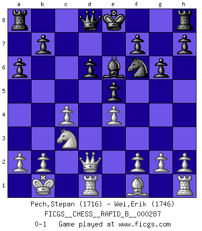 Last move : 0-1 2018 September 22 15:3:58 [Event "FICGS__CHESS__RAPID_B__000287"] [Site "FICGS"] [Date "2018.07.08"] [Round "1"] [White "Pech,Stepan"] [Black "Wei,Erik"] [Result "0-1"] [WhiteElo "1716"] [BlackElo "1746"] 1.e4 c5 2.Nf3 g6 3.d4 cxd4 4.Nxd4 Bg7 5.c4 d6 6.Nc3 Nc6 7.Be3 Nxd4 8.Bxd4 Bxd4 9.Qxd4 e5 10.Qd2 a6 11.O-O-O Be6 12.Kb1 Nf6 0-1 This chess game has been lost on time (started : 2018.07.08 11:17:2) Sicilian : Hungarian variation Queenside Castling by player White (move 11) Player Black won this chess game. Follow this game move after move (download)The Pin is mightier than the sword. (Fred Reinfeld) Das Schach hält seine Meister in eigenen Banden, Fesseln; auf vielerlei Weise formt es ihren Geist, so dass die innere Freiheit selbst des Stärksten beeinflusst wird. (Albert Einstein) Muchos se han convertido en Maestros de Ajedrez, nadie se ha convertido en el Maestro del Ajedrez. (Siegbert Tarrasch) Il n'y a pas de prix trop élevé au scalp de l'ennemi. (Koblentz) We're missing something. (Gregory House, House M.D.)