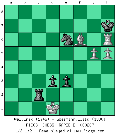 Last move : 1/2-1/2 2018 August 9 16:48:58 [Event "FICGS__CHESS__RAPID_B__000287"] [Site "FICGS"] [Date "2018.07.08"] [Round "1"] [White "Wei,Erik"] [Black "Gossmann,Ewald"] [Result "1/2-1/2"] [WhiteElo "1746"] [BlackElo "1990"] 1.d4 d5 2.c4 e6 3.Nf3 Nf6 4.Nc3 c6 5.e3 Nbd7 6.Qc2 Bd6 7.b3 O-O 8.Bb2 e5 9.Be2 e4 10.Nd2 Re8 11.cxd5 cxd5 12.Nb5 Nf8 13.Nxd6 Qxd6 14.h3 Bd7 15.Qc5 Qe6 16.Ba3 Rec8 17.Qd6 a6 18.Qxe6 Nxe6 19.Be7 Ne8 20.f3 f5 21.fxe4 fxe4 22.O-O Rc2 23.Bg4 h5 24.Bxe6+ Bxe6 25.Rf8+ Kh7 26.Nf1 Rac8 27.Ng3 g6 28.h4 Kg7 29.Re1 Rxa2 30.Ne2 Rb2 31.Nf4 Bf7 32.Rf1 Nd6 33.Rxc8 Nxc8 34.Bf6+ Kg8 35.Rc1 Nd6 36.Rc3 Ne8 37.Bg5 Kg7 38.Kf1 Kf8 39.Ke1 b5 40.Kd1 b4 41.Rc6 a5 42.Ra6 Rxb3 43.Rxa5 Rc3 44.Rb5 Kg8 45.Rxb4 Rxe3 46.Rb6 Ra3 47.Nxg6 Bxg6 48.Rxg6+ Kf7 49.Rh6 Rd3+ 50.Ke2 Rxd4 51.Rxh5 Ng7 52.Rh7 Ra4 53.g4 d4 54.h5 Ra2+ 55.Kd1 Kg8 56.Rh6 Rg2 57.Rg6 Kh7 58.Bf6 Ne6 59.g5 Rg1+ 60.Kc2 d3+ 61.Kc3 Rc1+ 62.Kd2 Rc2+ 63.Kd1 e3 64.Rh6+ 1/2-1/2 Queen's gambit declined Kingside Castling by player Black (move 7) Kingside Castling by player White (move 22) 10 pieces endgame at move 51 : White KRBPP , Black KRNPP WHITE : King + 1 Rook 1 Bishop 2 Pawns BLACK : King + 1 Rook 1 Knight 2 Pawns This chess game ended in a draw. Follow this game move after move (download)It is the aim of the modern school, not to treat every position according to one general law, but according to the principle inherent in the position. (Richard Reti) Ich möchte Schüler heranbilden, die das Vermögen haben, selbst zu denken und Kritik zu üben. (Emanuel Lasker) Repentinamente, me resultaba obvio en mi analisis que yo había pasado por alto lo que Fischer había visto en el tablero con la mas grande facilidad. (Mikhail Botvinnik) Un footballeur joue avec ses pieds, parfois avec sa tête. Un joueur d'échecs ne joue qu'avec sa tête. Et quand il ne joue plus, il meurt. (Jacob Murray) Players are not good because they find tactics, it is about the way to find the positions in which those tactics are hidden. (Luc-Olivier Leclerc)