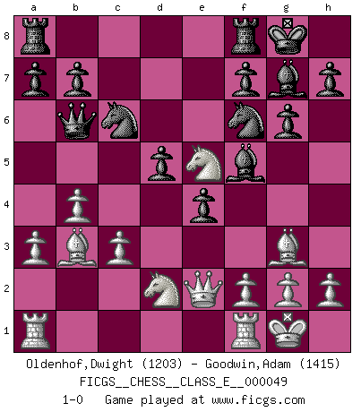 Last move : 1-0 2007 August 18 10:19:32 [Event "FICGS__CHESS__CLASS_E__000049"] [Site "FICGS"] [Date "2007.05.14"] [Round "1"] [White "Oldenhof,Dwight"] [Black "Goodwin,Adam"] [Result "1-0"] [WhiteElo "1203"] [BlackElo "1415"] 1.e4 c5 2.Nf3 g6 3.d4 cxd4 4.Qxd4 Nf6 5.Bc4 Bg7 6.Bf4 Nc6 7.Qd3 Nxe4 8.c3 Nf6 9.O-O O-O 10.a3 d6 11.Nbd2 Bf5 12.Qe2 e5 13.Bg3 Qb6 14.b4 d5 15.Bb3 e4 16.Ne5 1-0 This chess game has been lost on time (started : 2007.05.14 2:1:18) Sicilian : Hungarian variation Kingside Castling by player White (move 9) Kingside Castling by player Black (move 9) Player White won this chess game. Follow this game move after move (download)Chess is the art of analysis. (Mikhail Botvinnik) Jeder Fehler erscheint unglaublich dumm, wenn andre ihn begehen. (Georg Christoph Lichtenberg) El Ajedrez es un regaderazo frío para la mente. (Sir John Simon) Tous ces prétendus hommes politiques sont les pions, les Cavaliers, les Tours ou les Fous d'une partie d'échecs qui se jouera tant qu'un hasard ne renversera pas l'échiquier. (Honoré de Balzac) No man has ever achieved immortality in his own life time. (Unknown)