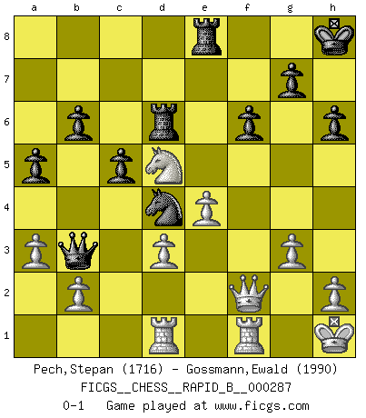 Last move : 0-1 2018 September 23 3:4:10 [Event "FICGS__CHESS__RAPID_B__000287"] [Site "FICGS"] [Date "2018.07.08"] [Round "1"] [White "Pech,Stepan"] [Black "Gossmann,Ewald"] [Result "0-1"] [WhiteElo "1716"] [BlackElo "1990"] 1.c4 c5 2.Nc3 Nf6 3.Nf3 Nc6 4.g3 d5 5.cxd5 Nxd5 6.Bg2 Nc7 7.d3 e5 8.O-O Be7 9.Nd2 O-O 10.Nc4 f6 11.f4 exf4 12.Bxf4 Ne6 13.Bd2 Rb8 14.Rc1 Kh8 15.Qe1 Qd7 16.Qf2 b6 17.Be4 Ncd4 18.Bg2 Bb7 19.Bxb7 Rxb7 20.Qg2 R7b8 21.e4 Rbd8 22.Nd5 Nc7 23.Nxc7 Qxc7 24.Ne3 Nc6 25.Nd5 Qd7 26.Qe2 Bd6 27.Bc3 Be5 28.Bxe5 Nxe5 29.Rcd1 Nc6 30.Qg2 Rfe8 31.Qf3 Re6 32.a3 Nd4 33.Qf2 Qa4 34.Rde1 Red6 35.Rd1 a5 36.Kh1 h6 37.Rfe1 Qb3 38.Rf1 Re8 0-1 This chess game has been lost on time (started : 2018.07.08 11:17:2) English : Symmetrical variation Kingside Castling by player White (move 8) Kingside Castling by player Black (move 9) Player Black won this chess game. Follow this game move after move (download)Morphy was probably the greatest genius of them all. (Bobby Fischer) Der Bart als Geschlechtszeichen mitten im Gesicht ist obszön. Daher gefällt er den Weibern. [Zugegeben, kein Schachzitat, aber unglaublich originell] (Arthur Schopenhauer) Cuando le juegas a Fischer, no es una cuestion de si vas a ganar o perder. Es una cuestion de si vas a sobrevivir. (Boris Spassky) L'attaque fait le spectacle, la défense gagne les matchs. (Dicton footballistique) There are more things in heaven and earth than practically anywhere else. (Unknown)