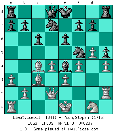 Last move : 1-0 2018 August 23 5:26:49 [Event "FICGS__CHESS__RAPID_B__000287"] [Site "FICGS"] [Date "2018.07.08"] [Round "1"] [White "Liwat,Lowell"] [Black "Pech,Stepan"] [Result "1-0"] [WhiteElo "1841"] [BlackElo "1716"] 1.d4 d5 2.c4 c6 3.e3 Bf5 4.Nc3 e6 5.g4 Bg6 6.h4 h5 7.g5 Nd7 8.f4 Bb4 9.Bd2 Ne7 10.a3 Bxc3 11.Bxc3 Be4 12.Rh2 Nf5 13.Qd2 dxc4 14.Bxc4 1-0 QGD Slav defense Player White won this chess game. Follow this game move after move (download)It is not a move, even the best move that you must seek, but a realizable plan. (Eugene Znosko-Borovsky) Herr Iljumschinow ist ein etwas merkwürdiger Geschäftsmann: Er arbeitet zusammen mit Leuten wie Muammar al-Gaddafi; früher ist das Saddam Hussein gewesen. (Joel Lautier) Botvinnik trató de alejar el misterio referente al Ajedrez, siempre relacionandolo a situaciones de la vida diaria. Solía llamar al Ajedrez un problema inexacto típico, similar a aquellos en que la gente tiene siempre que resolver a cada día. (Garry Kasparov) Roi des jeux et jeu des rois, les échecs portent en eux un sentiment d'infini. Ils donnent à celui qui s'est efforcé d'en approfondir les arcanes l'impression de n'être pas à la mesure de l'homme; en fait, ils constituent un résumé de l'univers, un microcosme, et figurent cette grande échelle qui, dans les plans de la lumière descend jusqu'à la matière, qui des abîmes insondables remonte jusqu'en l'infini de Dieu. (Pyrame) Now be brave and don't look back. Don't look back. (Shmi Skywalker in Star Wars ep.1)